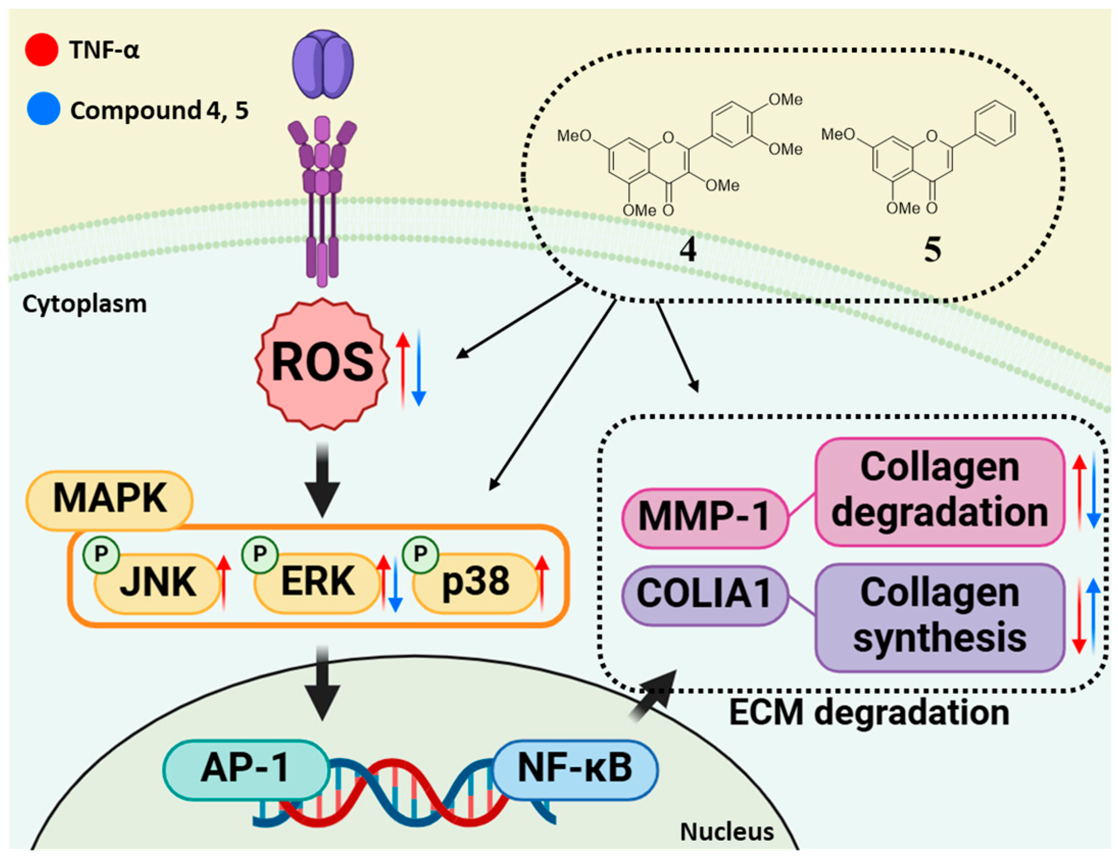 3.6. Effects of Methoxyflavones 4 and 5 on MAPK Phosphorylation in TNF-α-Treated NHDFs