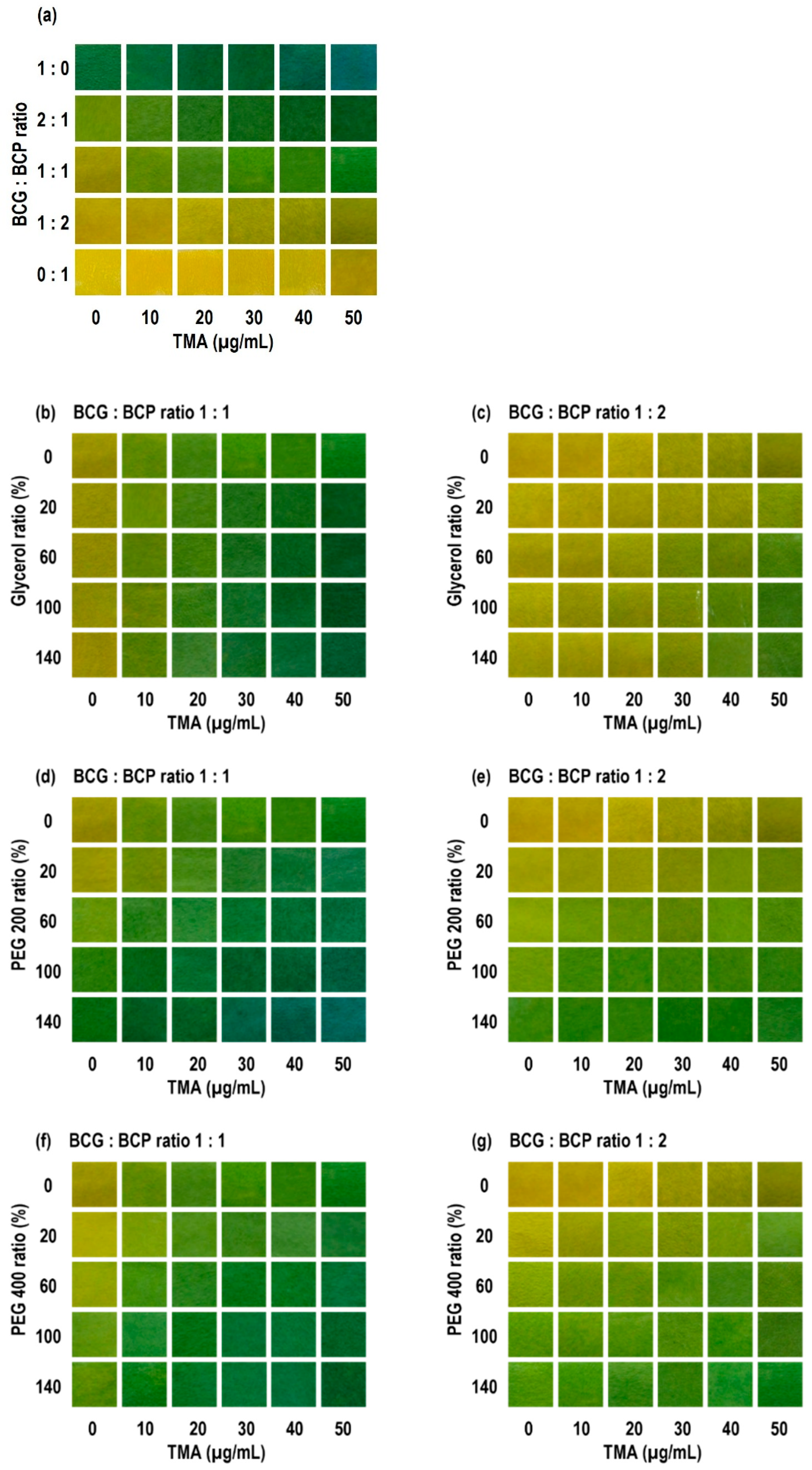 Figure 2 visually supports these quantitative results. All formulations exhibited a gradual, stepwise color transition as the pH changed. They appeared yellow in the acid form, shifted to a yellow-green shade at intermediate conditions, and finally turned green in the base form. Mixed dyes showed a sharper transition boundary than single dyes. G100-1 and G100-2 maintained a stable yellow baseline at 0 μg/mL of TMA, ensuring a higher sensitivity at low concentrations. As concentration increased, brightness (L) decreased, and the green component increased uniformly across tiles. Glycerol systems kept a yellow baseline, giving a wide transition window. Some PEG systems showed a green tone even without exposure, which could limit the extra color change at the start. Nonetheless, several PEG200/PEG400 middle- to high-loading films turned uniformly green as concentration increased, which improved readability in the higher range. In terms of spatial uniformity, glycerol systems showed smaller tile-to-tile variation in color difference, while a few high-PEG films showed early edge coloration. All images were taken and analyzed under identical camera and lighting conditions, and white balance effects were controlled as described in the Methods.