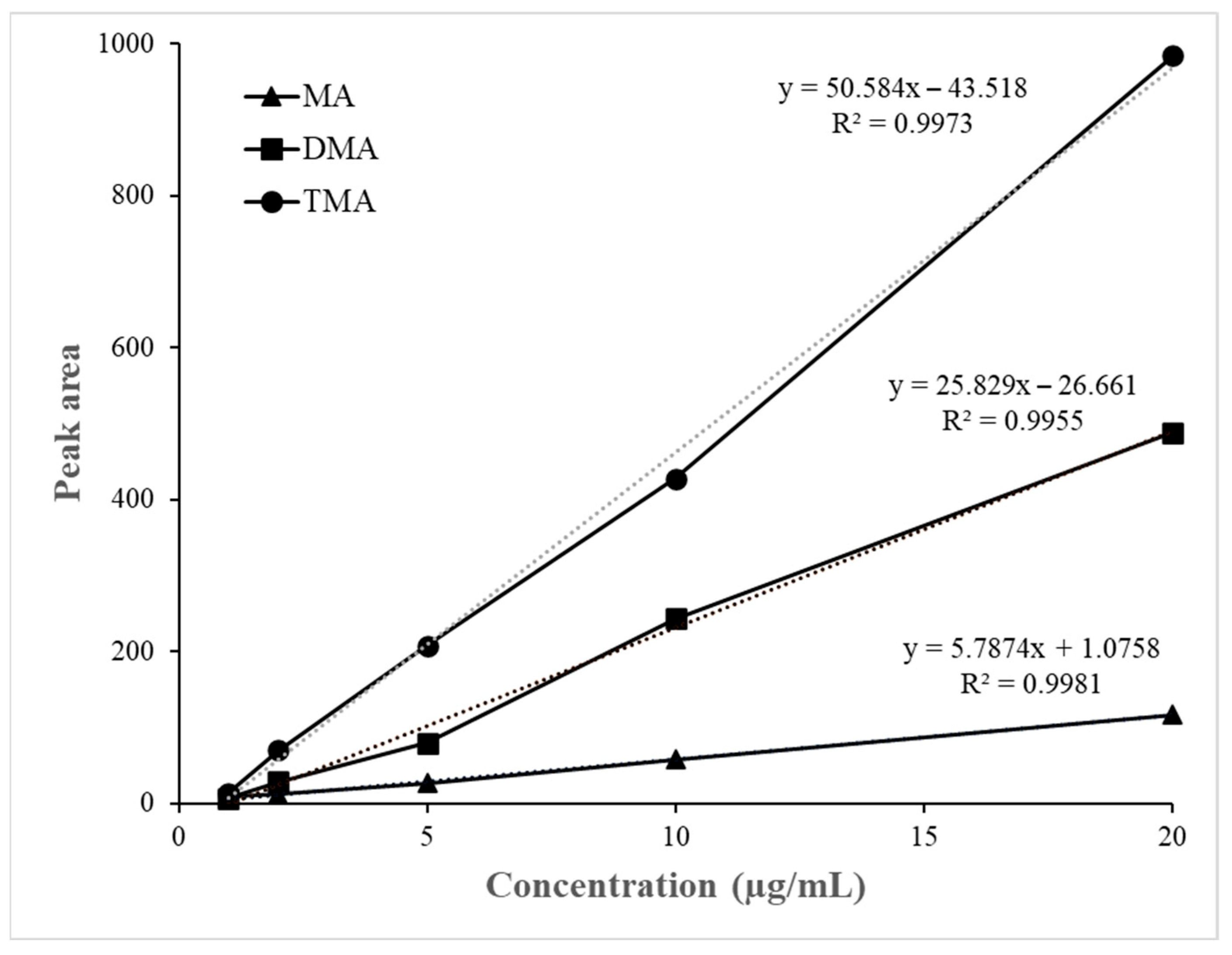 The calibration curves for MA, DMA, and TMA showed excellent linearity within the tested range (0–20 µg/mL), with correlation coefficients (R2) of 0.9981, 0.9955, and 0.9973, respectively (Figure 3).