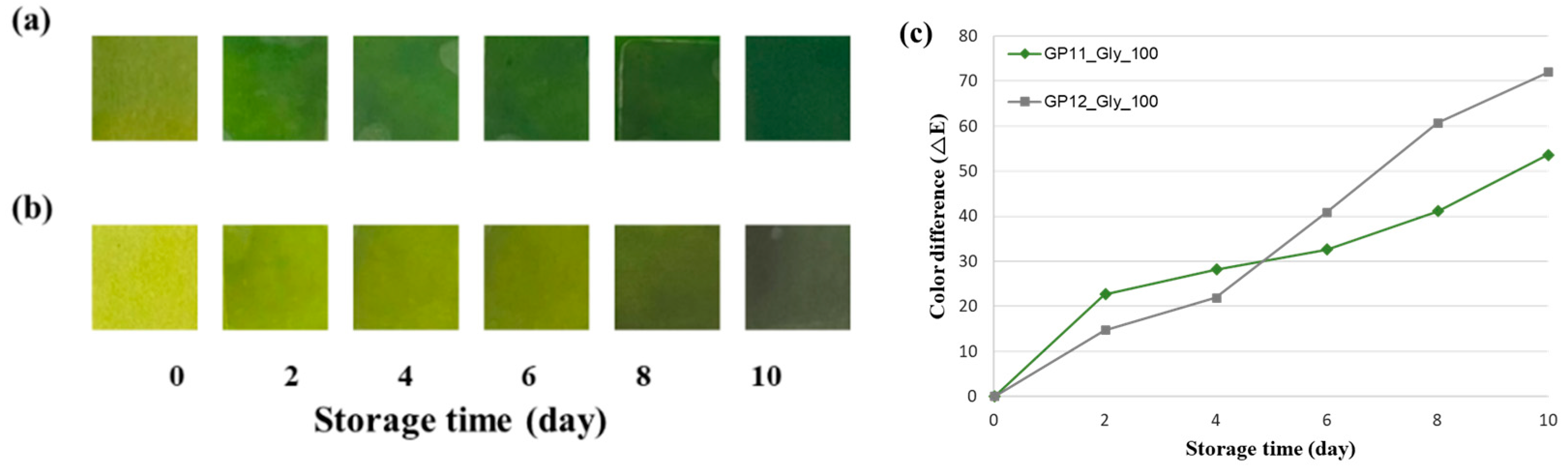 Figure 4a,b illustrate the progressive color change of the indicator labels (G100-1 and G100-2) during 10 days of chilled storage. The color gradually shifted from yellow-green to dark green or gray, reflecting the accumulation of volatile amines and the onset of spoilage. Correspondingly, the quantified color difference (ΔE) increased continuously with storage time (Figure 4c).