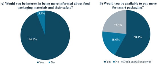 The interest of the participants in receiving more information about packaging safety materials is presented in Figure 2A, with 94.1% of the participants expressing interest in being more informed about this topic. In addition, those working or studying in the health sciences field showed significantly more interest in receiving more information (97.6% vs. 90.7%, respectively) than those from other fields. Figure 2B shows the participants’ willingness to pay more for food packaged in smart packaging technologies, and no statistical differences were found between groups. However, the majority of the inquired individuals were willing to pay more for smart packaging.