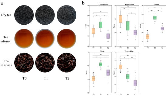 Results of sensory evaluation of black tea and GBTs. (a) Appearances of dry tea, tea liquor and infused tea. (b) Sensory scores. All values are mean ± SD, ‘*’, ‘**’ and ‘***’ indicate significant difference at p < 0.05, p < 0.01 and p < 0.001, respectively. And ‘ns’ means no significant difference between treatments.