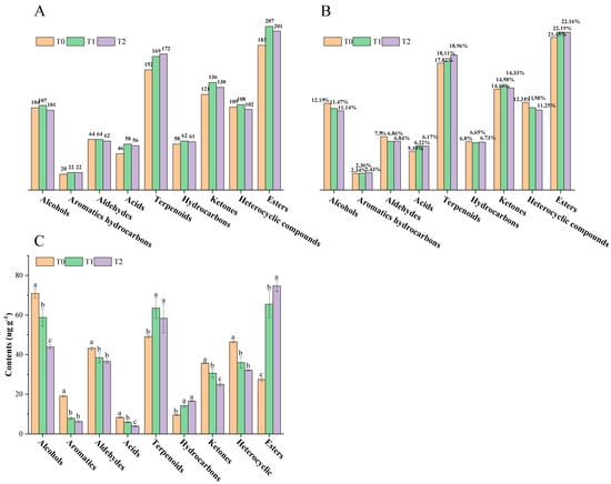 Aroma is one of the most important determinants of overall tea quality []. Thus, a total of 920 volatile compounds (including 183 esters, 152 terpenoids, 121 ketones, 105 heterocyclic compounds, 104 alcohols, 64 aldehydes, 58 hydrocarbons, 46 acids and 20 aromatics hydrocarbons) were detected in black tea base (T0), while 968 volatile compounds (including 207 esters, 169 terpenoids, 136 ketones, 108 heterocyclic compounds, 107 alcohols, 64 aldehydes, 62 hydrocarbons, 58 acids and 22 aromatics hydrocarbons) were detected in T1, and 943 volatile compounds (including 201 esters, 172 terpenoids, 130 ketones, 102 heterocyclic compounds, 101 alcohols, 62 aldehydes, 61 hydrocarbons, 56 acids and 22 aromatics hydrocarbons) were detected in T2 by HS-SPME-GC-MS (Figure 2A). Esters, terpenoids and ketones were the dominant categories in triple samples, which accounted for 21.45%, 17.82% and 14.19% in T0, 22.19%, 18.11% and 14.58% in T1, 22.16%, 18.96% and 14.33% in T2, respectively (Figure 2B). More information about the total ion chromatograms of volatile compounds in T0, T1 and T2 is included in Figure S2.