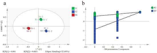 To characterize the differences among T0, T1 and T2, an OPLS-DA model was constructed. A data matrix of 982 (volatile compounds) × 9 (samples) was obtained. A clear discrimination among T0, T1, and T2 was obtained (Figure 3a). The parameters of the model (R2Y = 0.999, Q2 = 0.989) demonstrated its good explanatory and predictive ability. To verify the robustness of the model, 200-permutation tests were carried out. The result showed that R2 and Q2 were (0, 0.554) and (0, −0.822) respectively, indicating that the model was robust and there was no overfitting (Figure 3b).