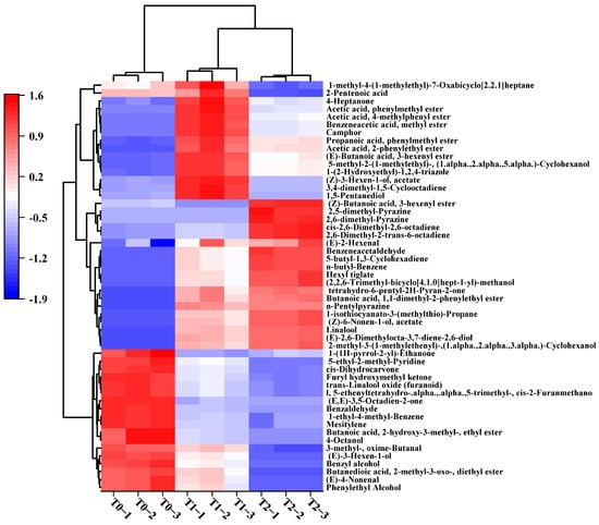 To further explore the key volatile compounds that differentiate raw black tea and GBTs, the variable importance in projection (VIP) was analyzed. Generally, a VIP value above 1 indicates that the variable plays a crucial role in group classification. In this study, 52 volatile compounds with VIP > 2.0 were identified. To visualize the differences among T0, T1, and T2, a heat map analysis was performed, and the results are shown in Figure 4. Clearly, the red color in the squares indicates higher content, while blue indicates lower content. Eighteen volatile compounds, such as 2-phenylethanol, phenylmethanol, octan-4-ol, (E)-hex-3-en-1-ol, 1,3,5-trimethylbenzene, 1-ethyl-4-methylbenzene, (E)-hex-2-enal, Benzaldehyde, (E)-non-4-enal, 3-methyl-oxime-Butanal, cis-Dihydrocarvone, and 1-(furan-2-yl)-2-hydroxyethanone, showed higher levels in T0 compared to T1 and T2. Conversely, some typical compounds like Linalool, (Z)-non-6-en-1-yl acetate, Camphor, 5-ethyl-2-methylpyridine, 2-Pentylpyrazine, (E)-Hex-2-enal, 2-phenylacetaldehyde, and Butylbenzene exhibited higher contents in GBTs (T1, T2) than in raw black tea (T0). Compared to T2, T1 had higher levels of 15 compounds, including Heptan-4-one, 4-methylphenyl acetate, (Z)-hex-3-enyl acetate, and 1,5-Pentanediol, while T2 showed elevated levels in 19 compounds such as Linalool, (E)-hex-2-enal, (Z)-Non-6-enyl acetate, (3E,6E)-octa-3,6-dien-2-one, Propane, 2-phenylacetaldehyde, 2-Pentylpyrazine, and Butylbenzene.