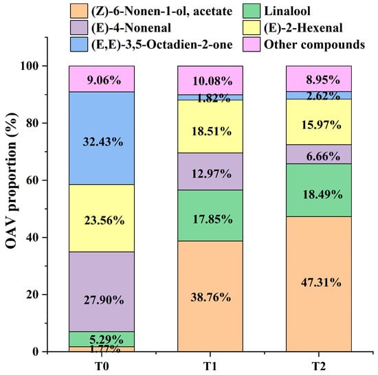 OAV proportion of the main volatile compounds in T0, T1 and T2.