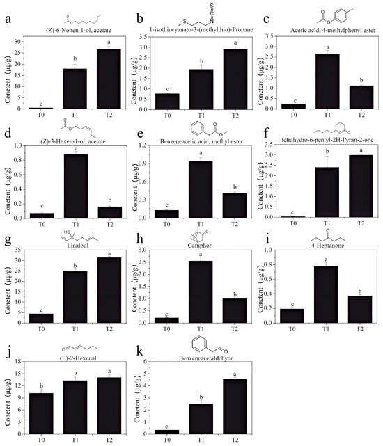 Structure and contents of 11 key volatile compounds (a–k) that are significantly higher in GBTs (T1 and T2) than in the black tea base (T0). Different lowercase letters (a, b and c) indicate significant difference at p < 0.05.