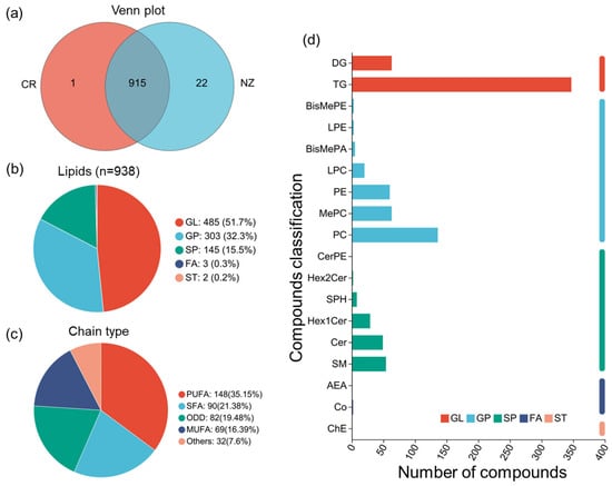 Summary of lipid composition of rabbit meat from Chuanbai Rex (CR) and New Zealand white (NZ). (a) Venn diagram; (b) lipid category pie chart; (c) classification of lipid chain unsaturation; (d) subclasses of lipids and the number of compounds.
