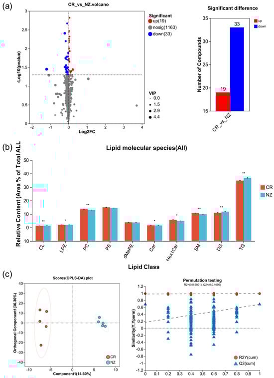 Differential lipid metabolites between rabbit meat from Chuanbai Rex (CR) and New Zealand White (NZ). (a) volcano plot with significant difference; (b) relative content of lipid class; (c) OPLS-DA score plot and permutation testing plot. Statistical differences are denoted by * p < 0.05 and ** p < 0.01.