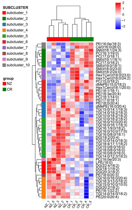 Clustering heatmap of differential lipid metabolites in longissimus dorsi from Chuanbai Rex (CR) and New Zealand White (NZ) rabbits for identification of potential biomarkers.