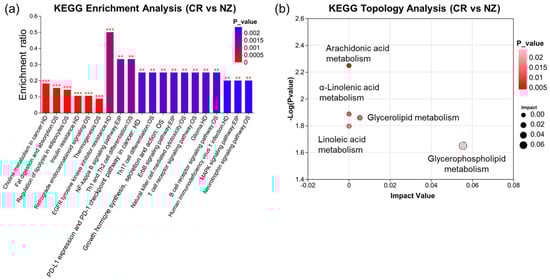 KEGG pathway enrichment analysis was conducted to explore lipid pathway variations between the two breeds. Figure 6a shows that differential lipid metabolites between the CR and NZ groups were significantly enriched in 20 KEGG pathways. The “EGFR tyrosine kinase inhibitor resistance” pathway had the highest enrichment ratio (0.5, p < 0.001), while “Human immunodeficiency virus 1 infection,” “MAPK signaling pathway,” and “Linoleic acid metabolism” were also significantly enriched. Topological analysis using the Relative-Betweenness Centrality metric identified five major metabolic pathways (Figure 6b): glycerophospholipid metabolism, glycerolipid metabolism, linoleic acid metabolism, α-linolenic acid metabolism, and arachidonic acid metabolism. Notably, PC (15:0/18:2) participated in four pathways (glycerophospholipid, linoleic acid, α-linolenic acid, and arachidonic acid metabolism), and TG (16:0/16:0/20:4) was involved in glycerolipid metabolism. Glycerophospholipid metabolism was the most significant pathway, with an impact value of 0.0554.