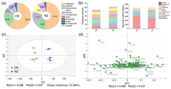 SPME-GC-MS analysis of characteristic volatile organic compounds (VOCs) in longissimus dorsi from Chuanbai Rex (CR) and New Zealand White (NZ) rabbits. (a) Pie chart of VOC percentages (%); (b) category content and absolute content (μg/kg) of VOCs; (c) PCA score plot; (d) PCA loading scatter plot.