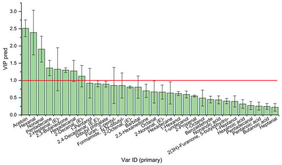 Volatile flavor compounds were analyzed using SIMCA 14.1 and TBtools v1.098769 for multivariate analysis of variance, according to our previously reported methods []. PCA was performed to analyze differences in VOCs among the rabbit meat from different breeds. The key VOCs with OAV ≥ 1 were further subjected to OPLS-DA and PLS-DA with predictive VIP. Pearson correlation analysis was performed between the differential lipids and volatile organic compounds using Origin 2023.