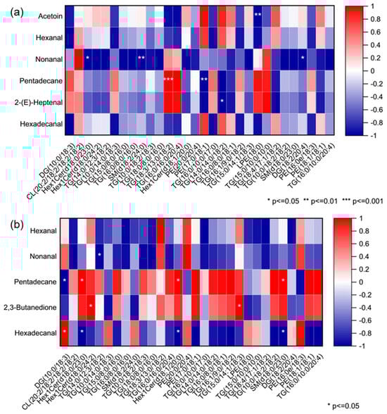 To further elucidate the relationship between lipid composition and VOCs of rabbit meat, Pearson correlation analysis was conducted between differential lipid metabolites (VIP ≥ 1) and the characteristic VOCs (VIP ≥ 1) across the two breeds (Figure 9). The results revealed several notable associations, with select key correlations highlighted (* p < 0.05, ** p < 0.01, *** p < 0.001). As shown in Figure 9a, TG (18:3/13:0/18:2) showed a strong positive correlation with pentadecane in CR, which likely arises from the oxidative degradation of TG (18:3/13:0/18:2), or it served as a metabolic source for the formation of this long-chain alkane. In contrast, six other lipid metabolites were negatively correlated with four key VOCs in CR, including acetoin, nonanal, pentadecane, and 2-(E)-heptenal. This was probably because they are not direct precursors to the formation of these key VOCs. Instead, they may represent competing metabolic pathways or lipid pools that are less susceptible to the oxidation and degradation reactions that generate these specific aroma compounds.