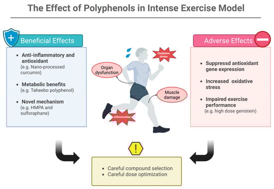 The Effect of Polyphenols in Intense Exercise Model. Polyphenols exert both protective and harmful actions during intense exercise: while certain compounds support anti-inflammatory, antioxidant, and metabolic adaptations, others may suppress antioxidant gene expression, increase oxidative stress, or impair performance at high doses. Appropriate compound selection and dose optimization are essential to maximize benefits and avoid adverse effects. HMPA: 3-(4-hydroxy-3-methoxyphenyl)propionic acid. Created in BioRender. Ma, S. (2025) https://BioRender.com/vx3cxfq (accessed on 20 November 2025).