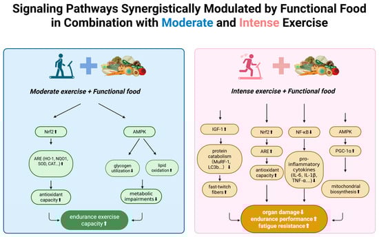 Synergistic modulation of signaling pathways by functional food and exercise. Functional foods enhance key molecular responses to moderate and intense exercise, including Nrf2-ARE antioxidant signaling, AMPK-mediated metabolic regulation, IGF-1–related muscle remodeling, and NF-κB suppression, collectively supporting improved endurance and reduced exercise-induced stress. Nrf2: Nuclear factor erythroid 2–related factor 2. ARE: Antioxidant Response Element. HO-1: Heme oxygenase-1. NQO1: NAD(P)H quinone dehydrogenase 1. SOD: Superoxide dismutase. CAT: Catalase. AMPK: AMP-activated protein kinase. IGF-1: Insulin-like growth factor-1. MuRF-1: Muscle RING-finger protein-1. LC3b: Microtubule-associated protein 1 light chain 3 beta. NF-κB: Nuclear factor kappa B. IL-6: Interleukin-6. IL-1β: Interleukin-1 beta. TNF-α: Tumor necrosis factor-alpha. PGC-1α: Peroxisome proliferator-activated receptor gamma coactivator-1 alpha. ↑: up regulation. ↓: down regulation. Created in BioRender. Ma, S. (2025) https://BioRender.com/7i6b8pw (accessed on 20 November 2025).