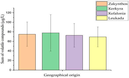 Sum of volatile compounds classes according to the geographical origin of olive oil of the Koroneiki olive cultivar from the Ionian islands. Error bars indicate statistically significant differences at the confidence level p < 0.05.