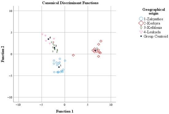 The most encouraging results were obtained for the olive oil samples from Zakynthos, where out of 17 initial samples, 16 were correctly allocated to Zakynthos (correct classification rate of 94.1%), while 1 sample was allocated to Kefalonia. Accordingly, for Kerkyra, out of the 11 initial samples, 8 were correctly classified in Kerkyra (correct classification rate of 72.7%), while 2 samples were allocated to Zakynthos and 1 to Leukada. Additionally, for the olive oil samples from Kefalonia, out of the 12 initial samples, 10 were correctly allocated to Kefalonia (correct classification rate of 83.3%), while 2 samples were allocated to Zakynthos. Finally, for the olive oil samples from Leukada out of the 7 initial samples, 5 were correctly allocated to Leukada (correct classification rate of 71.4%), while 2 were allocated to Kefalonia. The overall correct classification rate was 97.9% for the original and 83% for the cross-validation method. Between these values, the latter is considered very satisfactory given that samples of olive oil of the same cultivar were studied in terms of geographical origin differentiation (Figure 3). The group centroid values of the discriminant functions (coordinates) of LDA were: (−1.251, −3.017), (6.624, 0.841), (−2.240, 1.489), and (−3.531, 3.454) for Zakynthos. Kerkyra, Kefalonia, and Leukada, respectively.