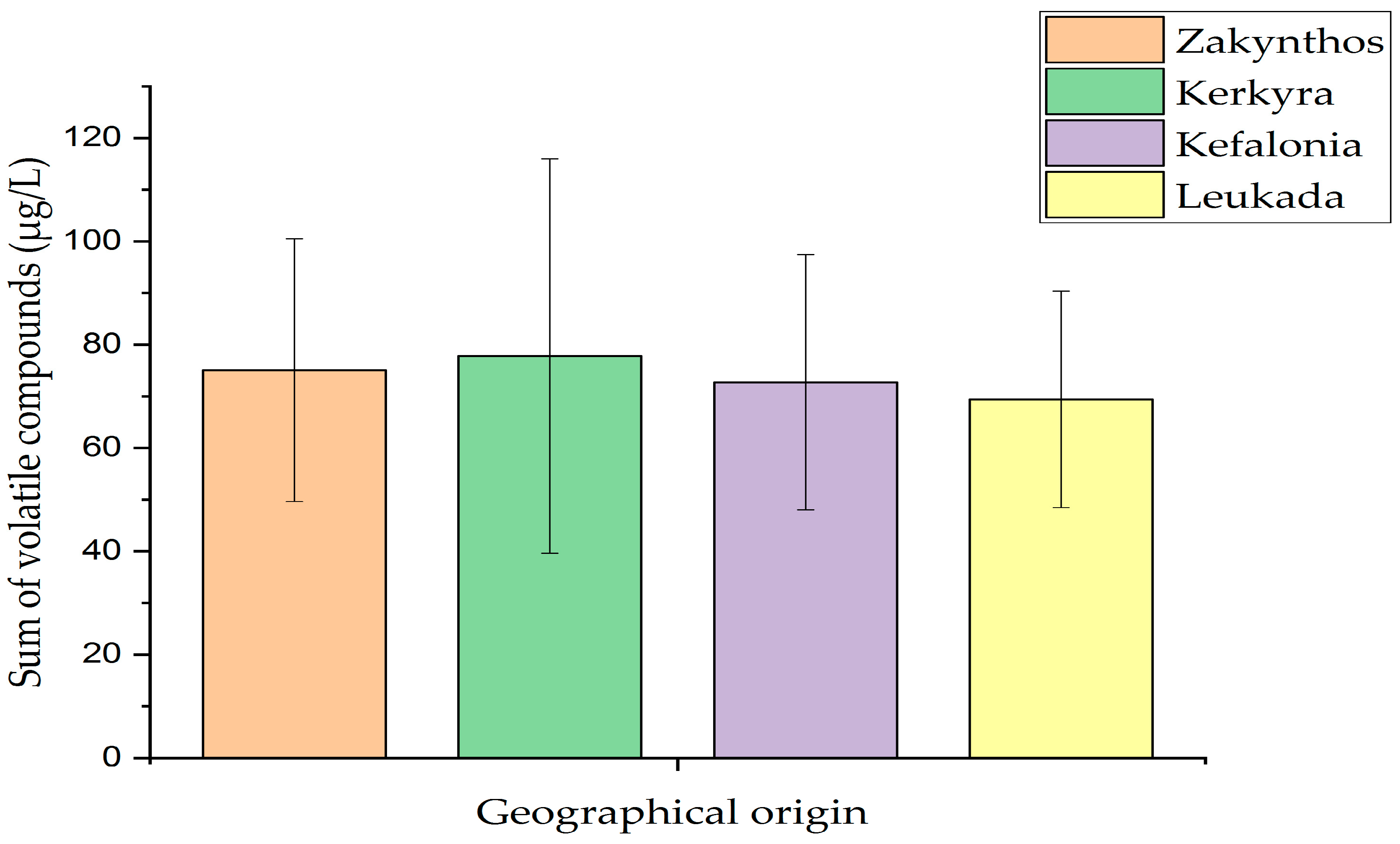 3.1. Volatile Compounds of Olive Oil of the Koroneiki Olive Cultivar from the Ionian Islands