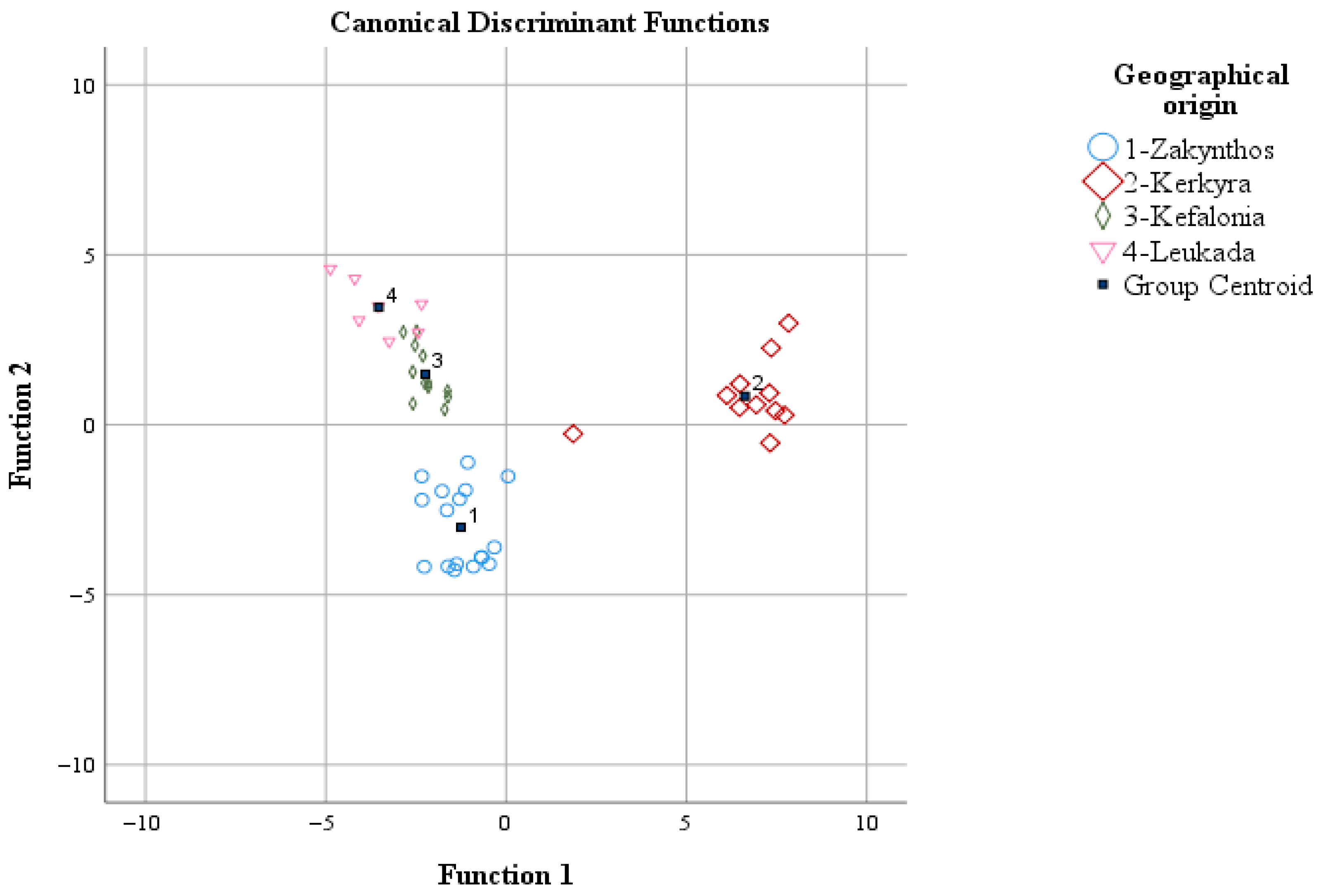 3.2. Regional Differentiation of Olive Oil Samples of the Koroneiki Olive Cultivar from the Ionian Islands