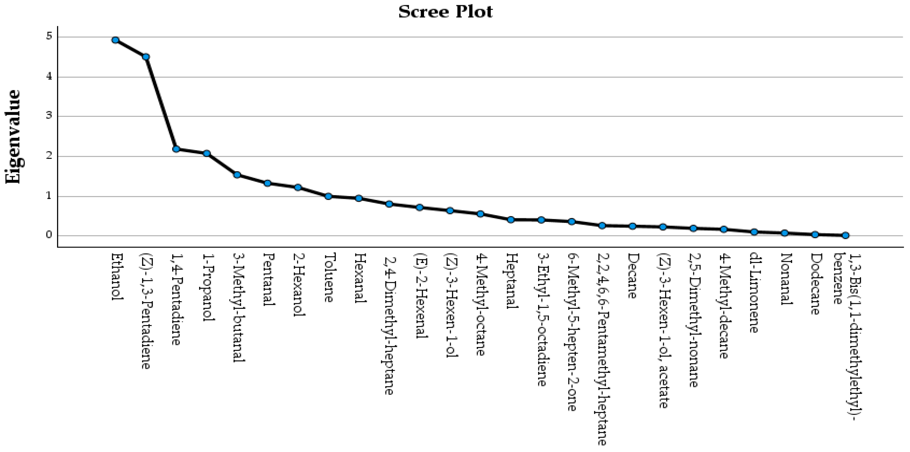 | 28.01 | 6-Methyl 5-hepten-2-one | 1056 | 6.49 ± 7.67 | 0.65 ± 0.72 | 0.60 ± 0.92 | Nd | 0.708 | 5.898 | 0.002 |
