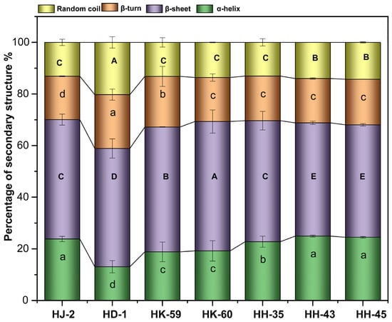 FTIR analysis of the amide I region revealed significant differences in protein secondary structure, which clustered by varietal group (Figure 2). Variety HD-1 displayed a unique structural signature, characterized by the lowest α-helix content (13.07%) and concurrently high β-turn (19.78%) and random coil (17.92%) contents. Conversely, the HH-series varieties (HH-35, HH-43, HH-45) were consistently characterized by elevated α-helix content (>22%), with HH-43 exhibiting the highest value (24.96%). HK-60 showed the highest β-sheet content (50.11%), while HH-43 had the lowest (43.56%). These distinct secondary structure profiles suggest fundamental differences in protein flexibility and unfolding potential among the varieties.