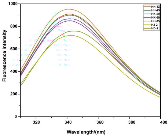 Intrinsic fluorescence spectroscopy provided insights into the compactness of the protein tertiary structure (Figure 3). While all varieties exhibited similar maximum emission wavelengths (λmax, 341–343 nm), indicating tryptophan residues in moderately polar environments, the fluorescence intensity varied significantly. HD-1 exhibited the highest fluorescence intensity (412 a.u.), suggesting a compact, stable tertiary structure with tryptophan residues effectively shielded from the solvent. In contrast, HJ-2 showed the lowest intensity (298 a.u.), indicating a more open or partially unfolded conformation with greater solvent exposure of tryptophan residues. The other varieties displayed intermediate intensities, with their stability generally aligning with their functional performance. The observed differences in fluorescence intensity without significant λmax shifts can be attributed to fluorescence quenching mechanisms. When proteins unfold or adopt looser conformations, tryptophan residues become more accessible to solvent molecules and nearby quenching groups. Water molecules act as dynamic quenchers through collisional interactions, while polar amino acid residues (particularly protonated carboxyl groups from Asp and Glu) and disulfide bonds can quench fluorescence through electron transfer mechanisms. Additionally, increased conformational flexibility in partially unfolded states enhances non-radiative energy dissipation. The pattern observed here—where HJ-2 shows reduced intensity compared to HD-1 suggests that genetic or compositional differences between varieties result in varying degrees of tertiary structure compactness, with implications for protein functionality and stability during processing.