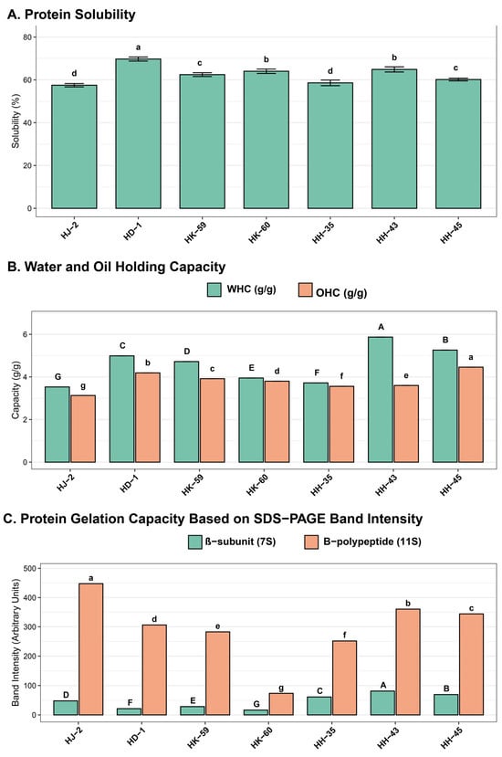 Comparative analysis of functional properties in soybean protein isolates: (A) protein solubility (%), (B) water holding capacity (WHC, teal bars) and oil holding capacity (OHC, orange bars) in g/g, (C) protein subunit composition showing β-subunit/7S (teal) and B-polypeptide/11S (orange) band intensities from SDS-PAGE analysis. Values are means ± SE (n = 3). Different letters indicate statistically significant differences (p < 0.05) according to Tukey’s HSD. Identical letters indicate no significant difference.
