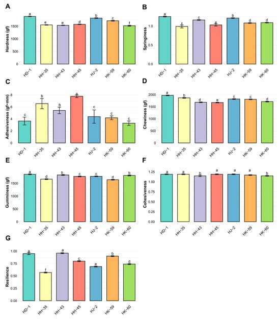 Textural profile analysis (TPA) of soybean protein isolate gels from different varieties. Texture profile analysis parameters: (A) hardness, (B) springiness, (C) adhesiveness, (D) chewiness, (E) gumminess, (F) cohesiveness, and (G) resilience. HD-1 demonstrated superior textural characteristics, with the highest values for hardness, chewiness, and gumminess, which correlated with its elevated storage modulus. HH-35 showed the lowest hardness but the highest adhesiveness. Data represent means ± SE (n ≥ 6). Different lowercase letters indicate statistically significant differences (p < 0.05) according to Tukey’s HSD. Identical letters indicate no significant difference.