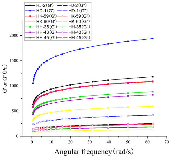 Dynamic oscillatory rheology revealed gel viscoelastic behavior across the frequency range 0.1–100 rad/s (Figure 6). All varieties exhibited gel-like behavior, with storage modulus (G′) exceeding loss modulus (G″) across the entire frequency spectrum, indicating predominantly elastic character with stable three-dimensional networks. Both G′ and G″ increased with frequency for all samples. At 1 rad/s, G′ values ranged from 2847 Pa (HK-60) to 6892 Pa (HD-1), while G″ values varied from 421 Pa (HK-60) to 894 Pa (HD-1). HD-1 exhibited the highest G′ (6892 Pa) and G″ (894 Pa), indicating the stiffest, most elastic gel network. HK-60 demonstrated the lowest modulus values, consistent with its soft texture profile. The tan δ values (G″/G′) ranged from 0.13 (HD-1) to 0.15 (HK-60), confirming solid-like elastic behavior across all varieties.