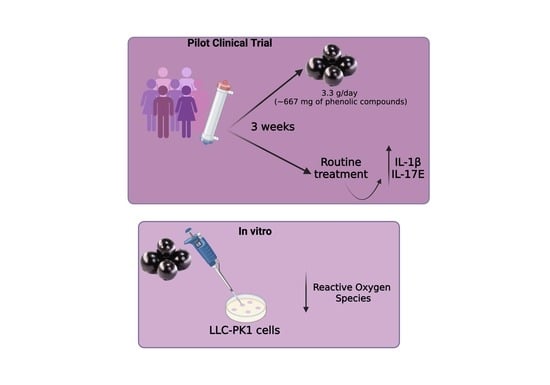 Lima, L.S.; Brito, J.S.d.; Ribeiro-Alves, M.; Coutinho-Wolino, K.S.; Duarte, R.d.S.P.; Valverde, R.H.F.; Einicker-Lamas, M.; Berretta, A.A.; Sanz, C.L.; Nakao, L.S.; et al. Effects of the Brazilian Native Fruit Jaboticaba (Plinia cauliflora) Peel on Inflammatory and Oxidative Stress Pathways: Insights from a Pilot Study in Hemodialysis Patients and Renal Cell Models. Foods 2025, 14, 4030. https://doi.org/10.3390/foods14234030
