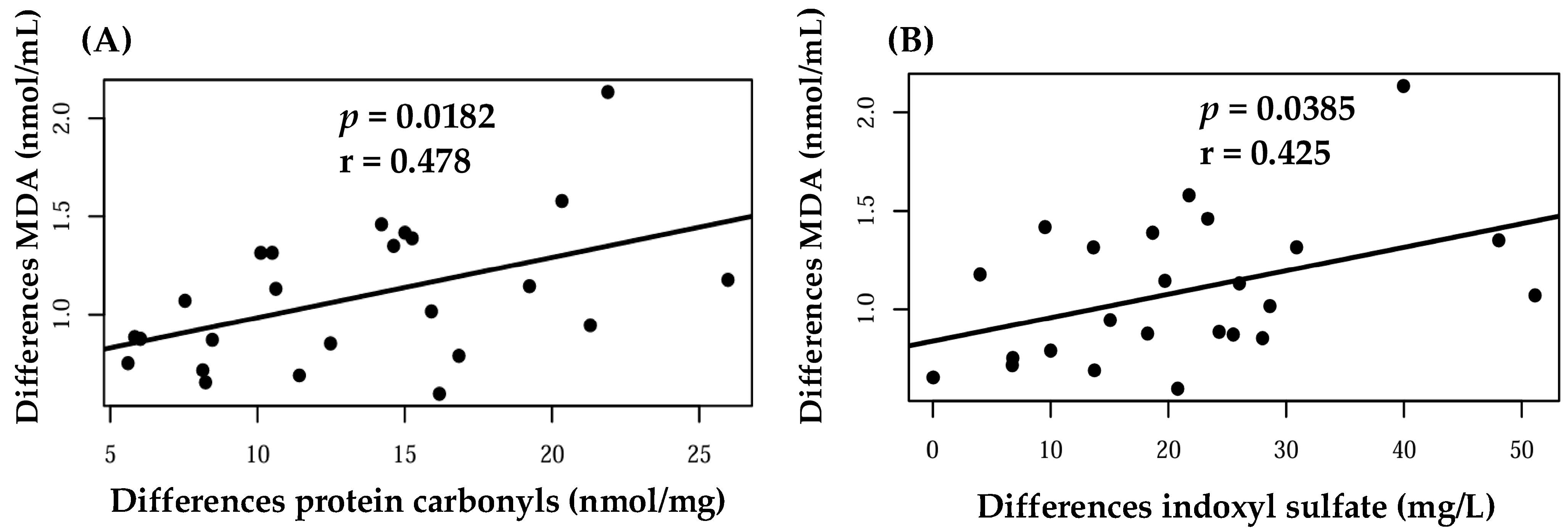 | p-cresyl sulfate (mg/L) | 12.45 (3.3–21.5) | 10.7 (1.6–19.8) | 0.94 | 21.1 (11.1–31.6) | 14.2 (3.9–24.4) | 0.14 |