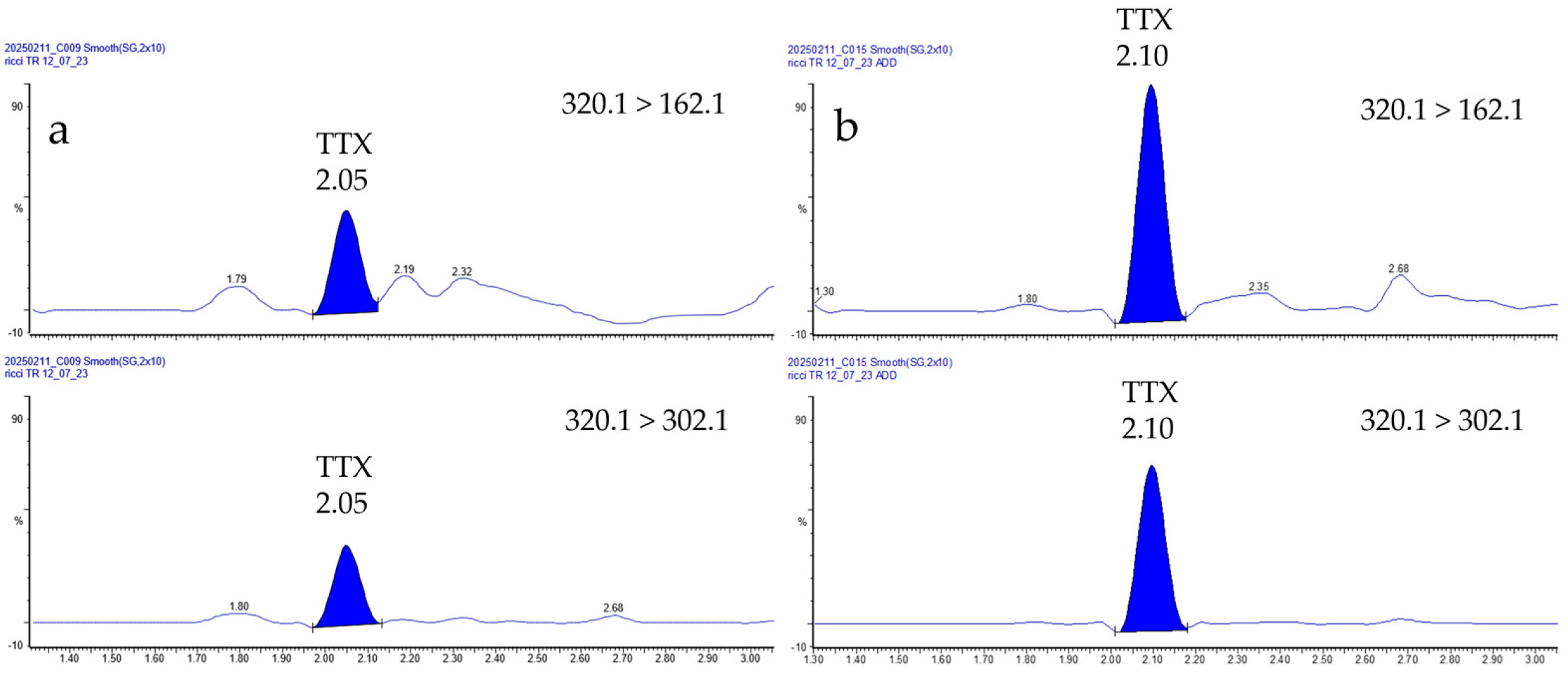 - Mazza, S.; Bacchiocchi, S.; Siracusa, M.; Diomedi, G.; Barchiesi, F.; Calandri, E.; Piersanti, A. TTXs in molluscs and blue crabs from Adriatic Sea: Do these species represent a risk for human consumption? In Proceedings of the 12th MS J-Day, Pisa, Italy, 22–23 May 2025. [Google Scholar]