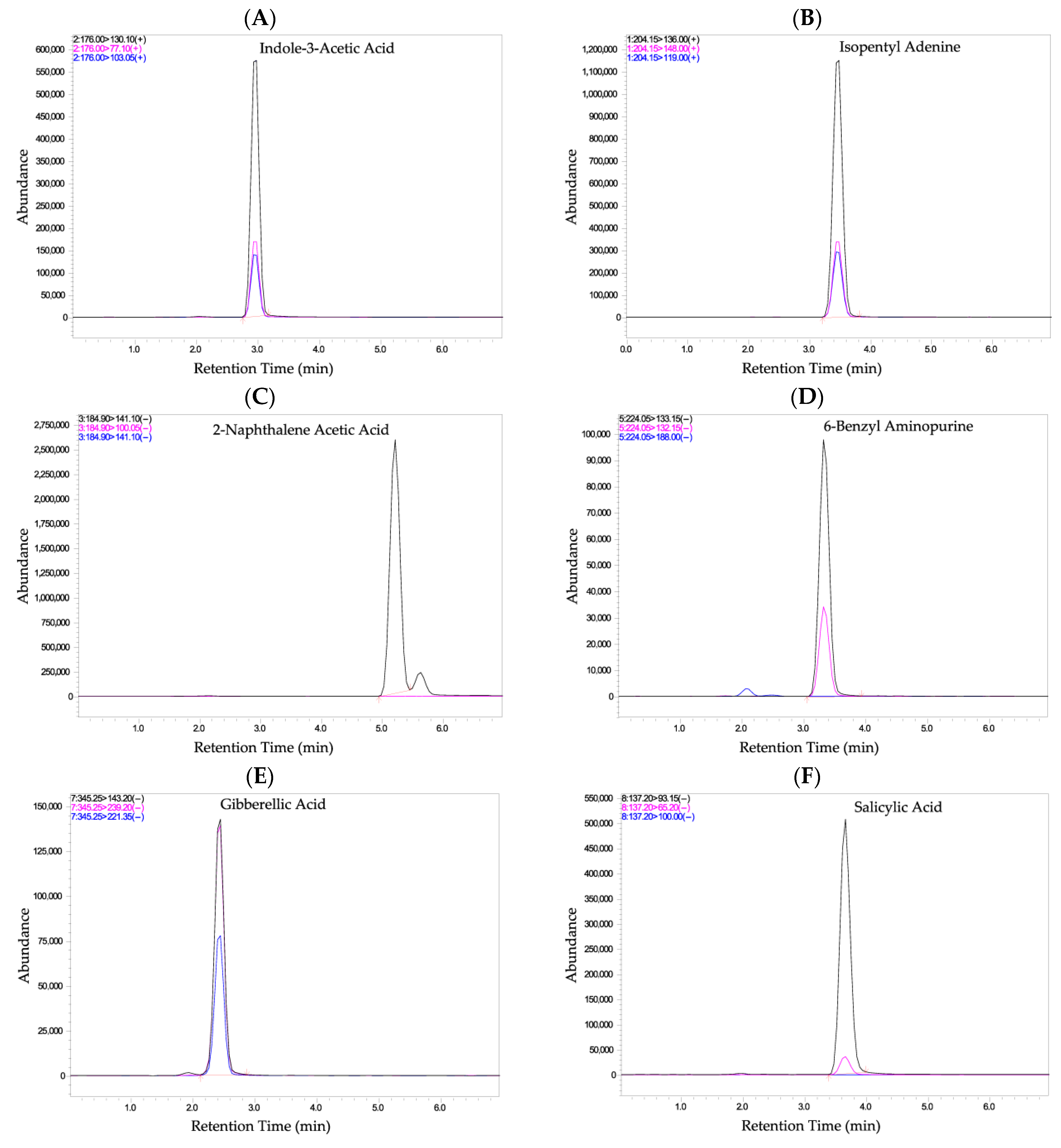 - Chu, J.; Fang, S.; Xin, P.; Guo, Z.; Chen, Y. Quantitative Analysis of Plant Hormones Based on LC-MS/MS. In Hormone Metabolism and Signaling in Plants; Academic Press: Cambridge, MA, USA, 2017; pp. 471–537. [Google Scholar]