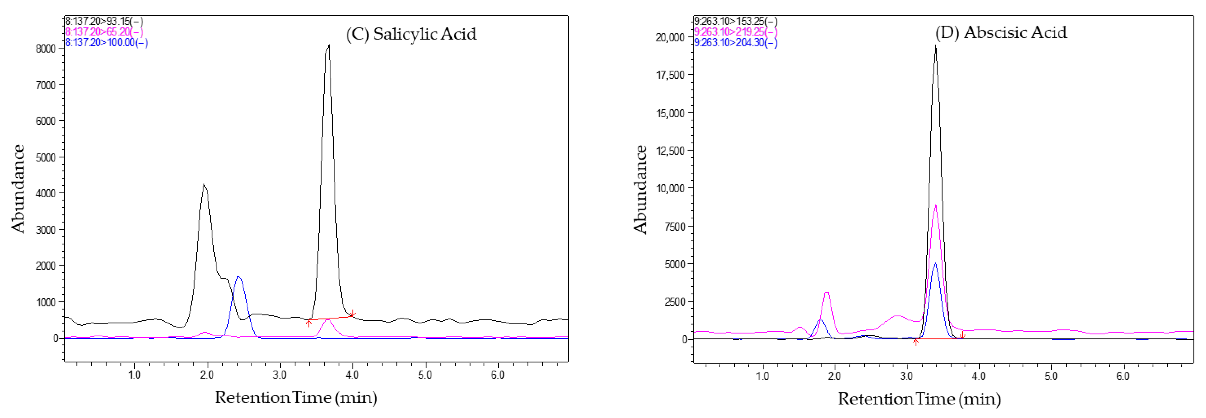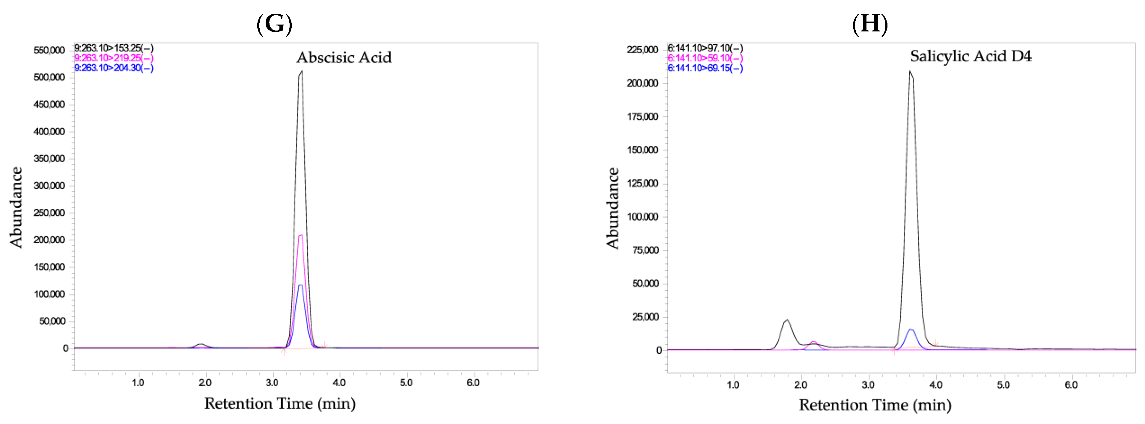 - Fu, J.; Chu, J.; Sun, X.; Wang, J.; Yan, C. Simple, Rapid, and Simultaneous Assay of Multiple Carboxyl Containing Phytohormones in Wounded Tomatoes by UPLC-MS/MS Using Single SPE Purification and Isotope Dilution. Anal. Sci. 2012, 28, 1081–1087. [Google Scholar] [CrossRef]