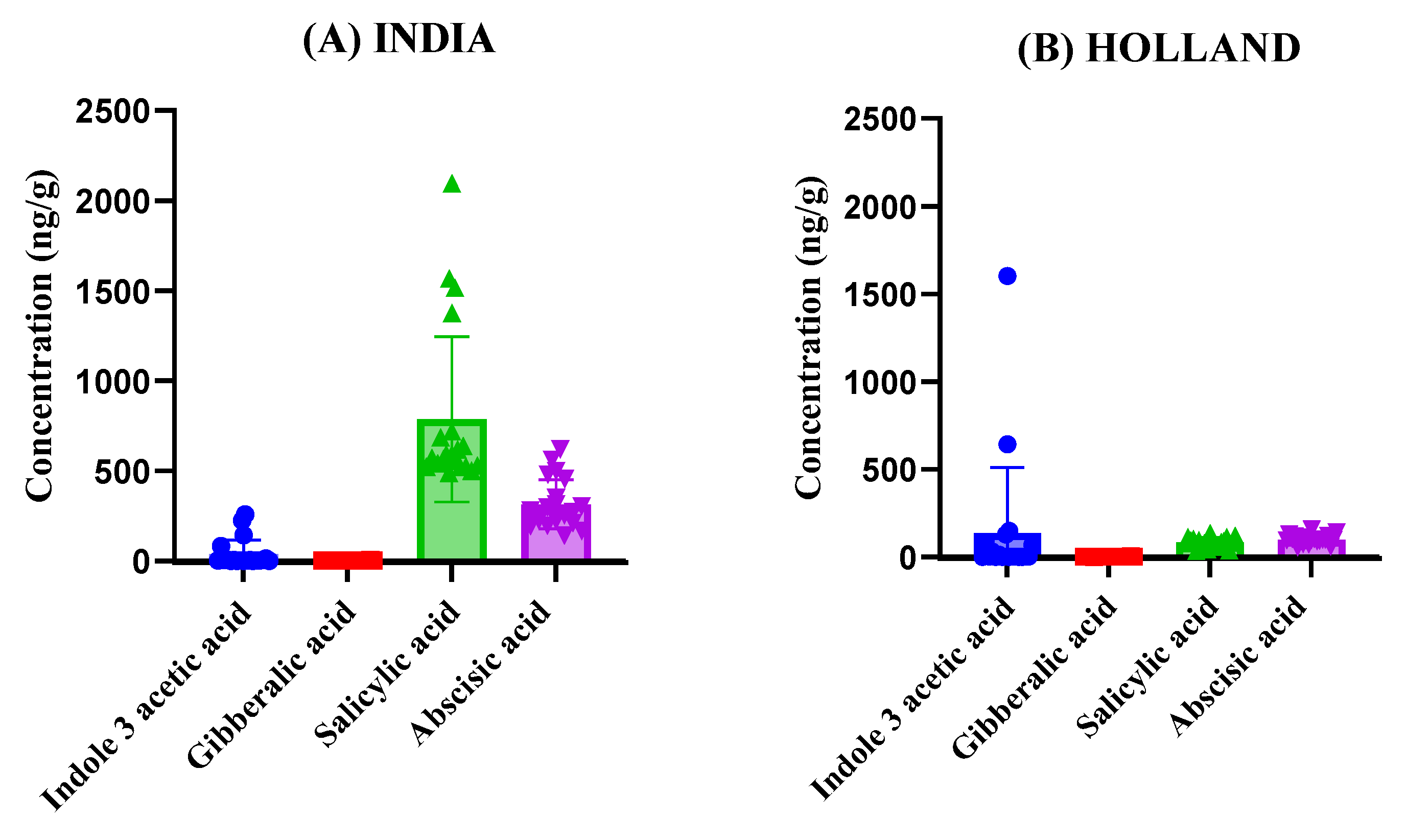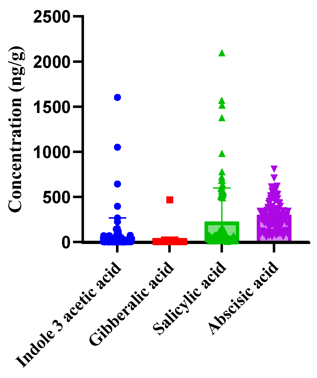 - Su, Y.; Xia, S.; Wang, R.; Xiao, L. Phytohormonal Quantification Based on Biological Principles. Horm. Metab. Signal. Plants 2017, 13, 431–470. [Google Scholar]