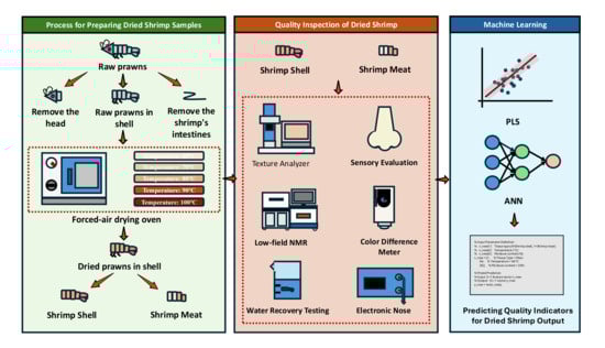 - Xu, W.; Zhang, F.; Wang, J.; Ma, Q.; Sun, J.; Tang, Y.; Wang, J.; Wang, W. Real-time monitoring of the quality changes in shrimp (Penaeus vannamei) with hyperspectral imaging technology during hot air drying. Foods 2022, 11, 3179. [Google Scholar] [CrossRef] [PubMed]