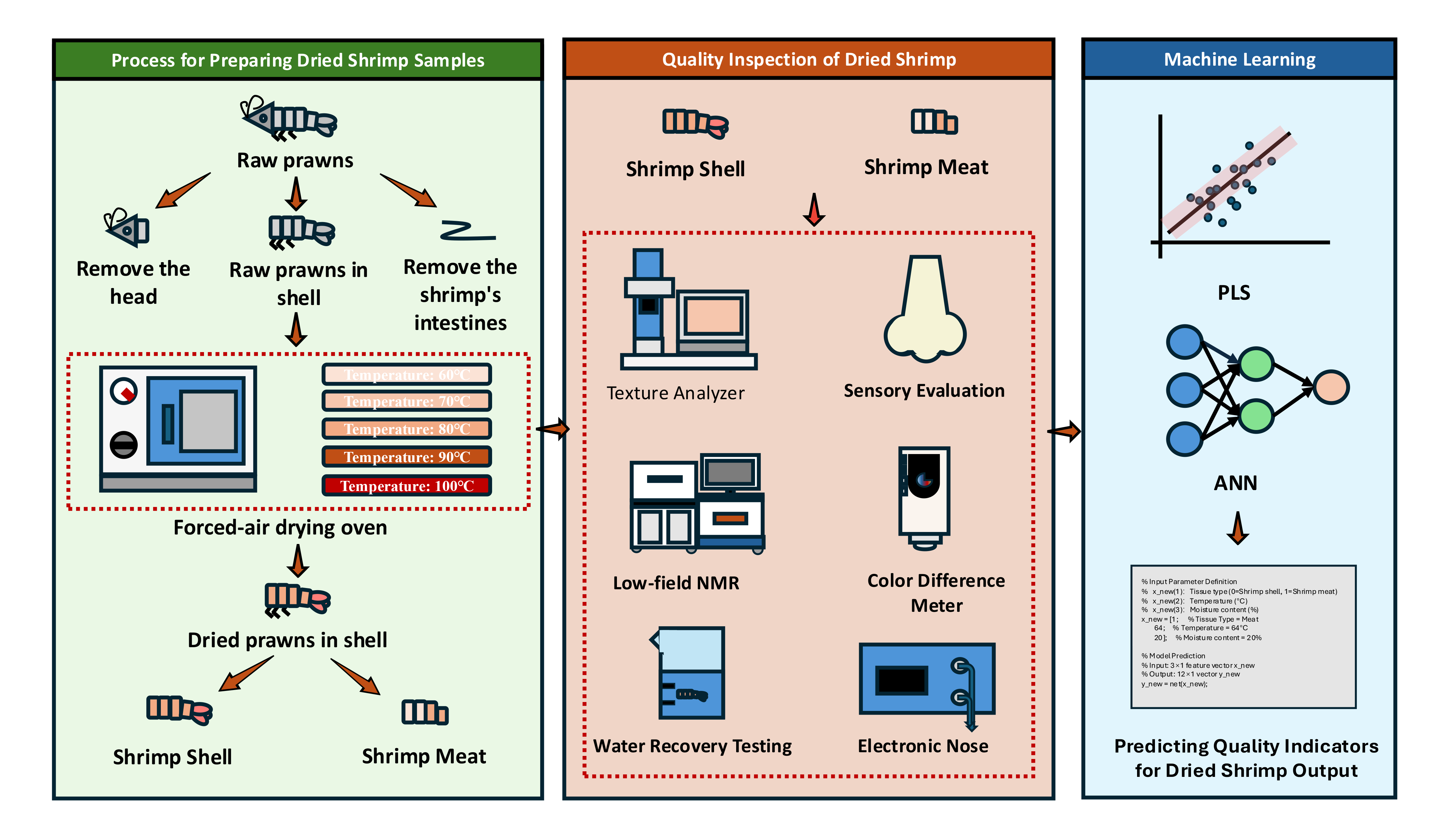| Shrimp meat | 25 | Visual inspection and color difference analysis (5) | Rehydration ratio, sensory evaluation, e-nose analysis, TPA (20, each 5) |