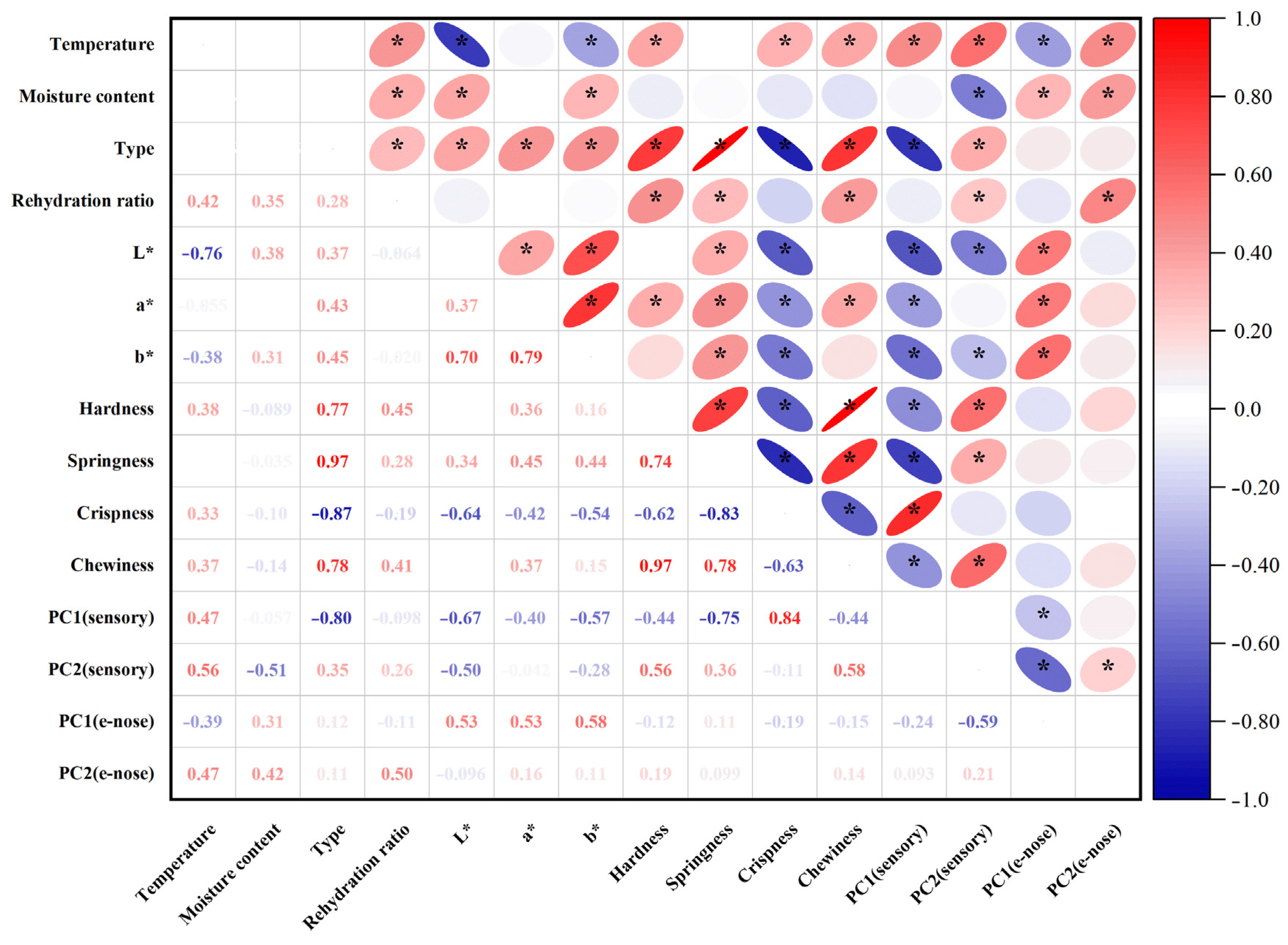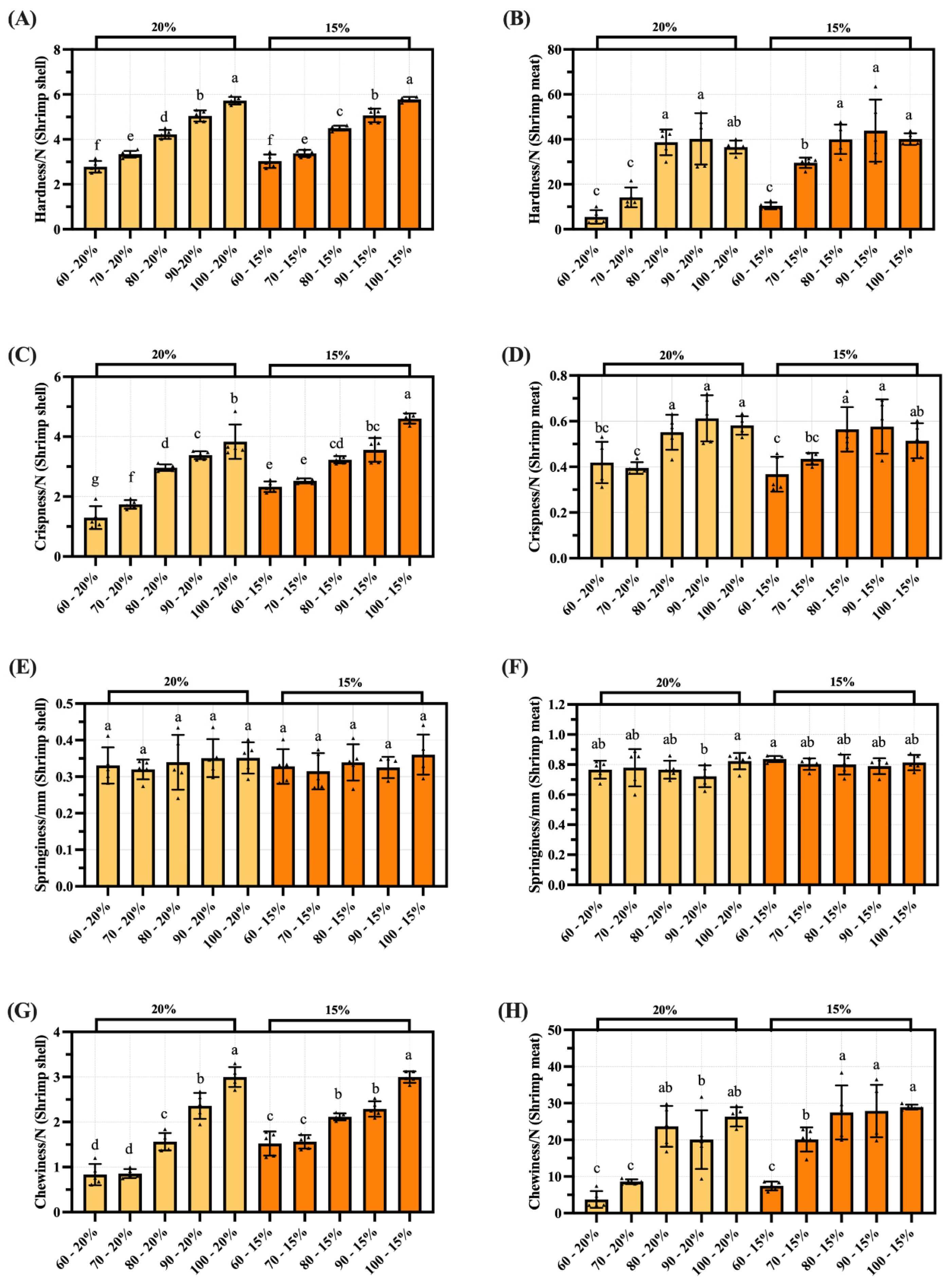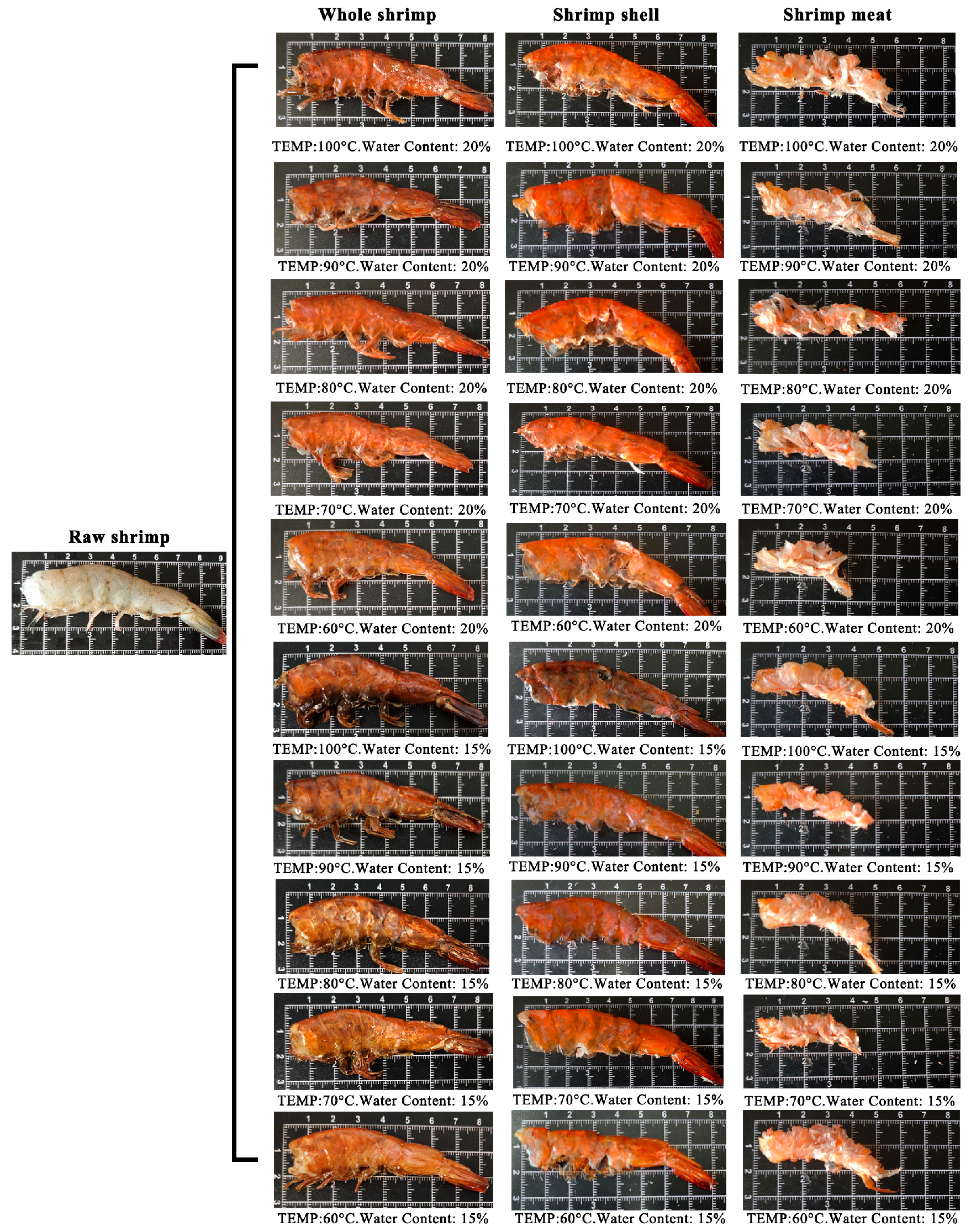 | Shrimp shell | 25 | Visual inspection and color difference analysis (5) | Rehydration ratio, sensory evaluation, e-nose analysis, TPA (20, each 5) |