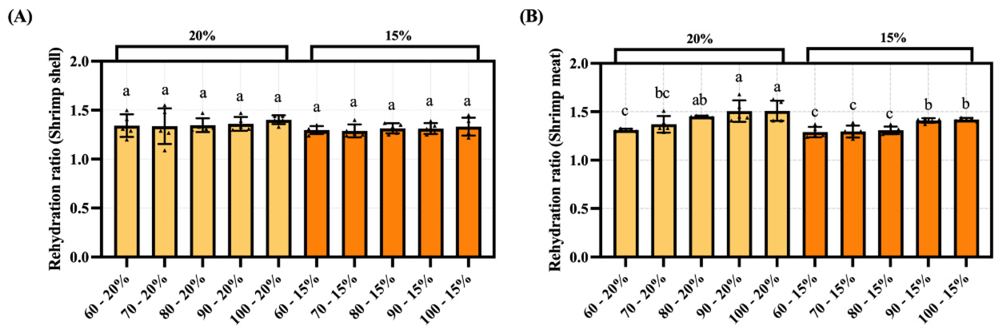 3.6. The Impact of Hot-Air Drying Temperature on the Rehydration Ratio of Dried Shrimp Shell and Meat