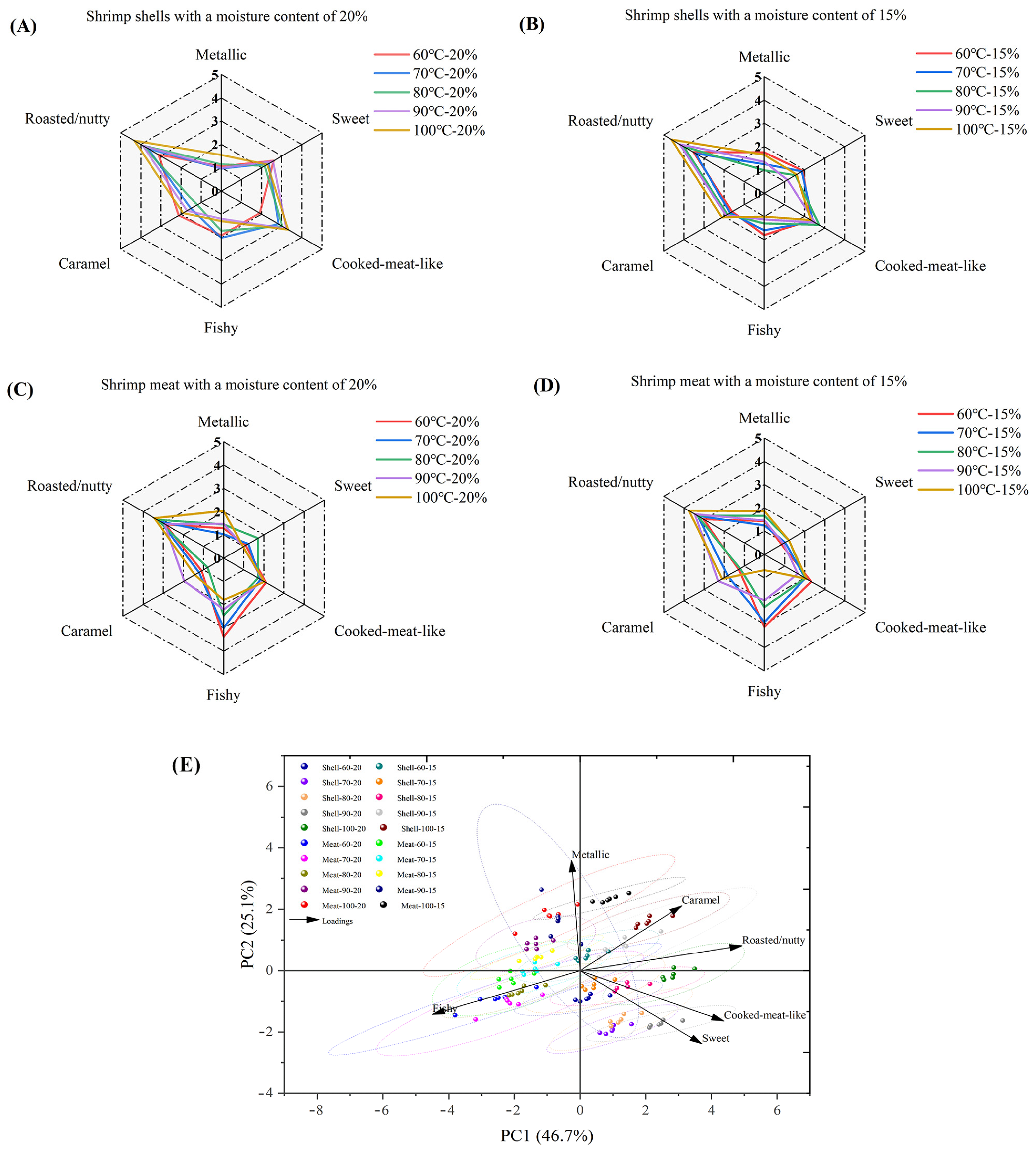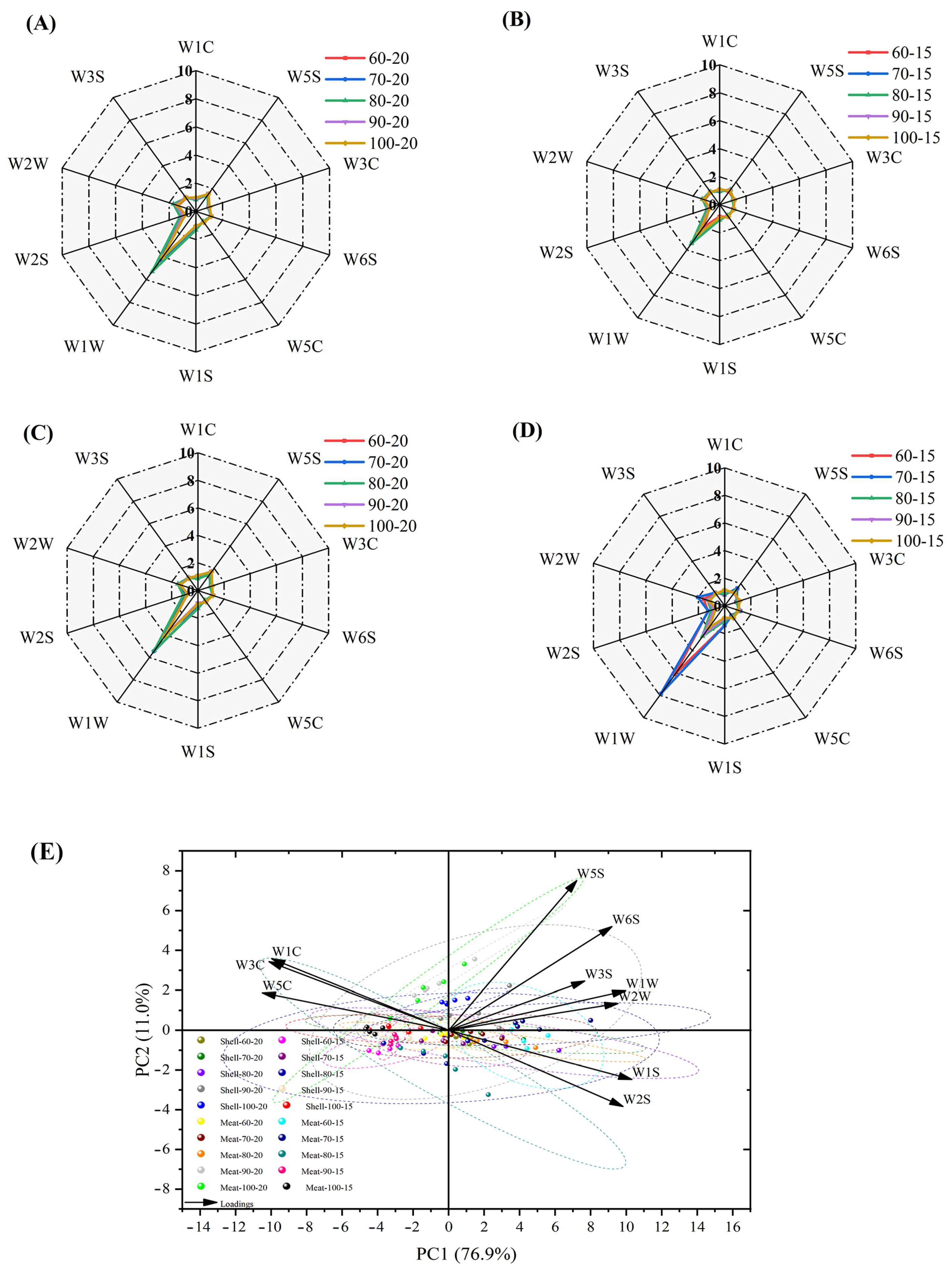 3.8. E-Nose Analysis of Dried Shrimp Shell and Meat