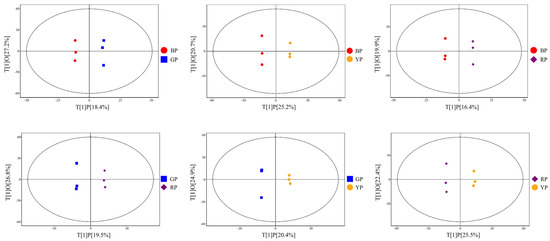 Based on the self-built local tomato metabolite database, 910 metabolites were identified in tomato samples via qualitative and quantitative analyses. Prior to multivariate statistical analysis, all metabolite data were normalized by total ion current (TIC) scaling, and repeated analyses with TIC-normalized data. To compare metabolite profiles of four color tomato groups (BP, GP, RP, YP) and assess data quality, PCA was performed on 12 samples plus quality control (QC) samples. As shown in Figure S1, PC1 and PC2 explained 19.9% and 10.3% of the variance, respectively. The four color groups showed no clear separation via this unsupervised method, while QC samples clustered tightly, confirming data reliability. Subsequently, supervised OPLS-DA was applied to identify inter-group differences. In Figure 2, samples from different color groups were well separated along t[1]P (predictive component, 16.4–25.5% variance explained) and t[1]O (orthogonal component, 19.9–27.2% variance explained). OPLS-DA models exhibited strong performance, with R2X (0.364–0.479), R2Y (0.999–1.000), and Q2 (0.429–0.677). Subsequently, the possibility of sample overfitting was ruled out through the OPLS-DA permutation test (Figure S2). The above results indicate that there are significant differences in metabolites among tomato samples of different colors.
