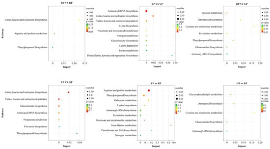 In this study, KEGG significant enrichment results of differential metabolites screened based on VIP > 1 and p < 0.05 were shown in Figure 4 (detailed pathways in File S4). Red vs. Yellow comparisons identified 14 enriched pathways (1 significantly enriched), where L-glutamine, L-lysine, L-isoleucine, and L-leucine were significantly enriched in the aminoacyl-tRNA biosynthesis pathway; Red vs. Green and Red vs. Brown comparisons yielded 7 and 3 enriched pathways, respectively, with no significant enrichment; Yellow vs. Green comparisons resulted in 7 enriched pathways (2 significantly enriched), with L-leucine and L-isoleucine co-enriched in both the valine, leucine and isoleucine biosynthesis pathway and valine, leucine and isoleucine degradation pathway; Yellow vs. Brown comparisons showed 19 enriched pathways (1 significantly enriched), where L-citrulline, L-arginine, n-acetyl-l-glutamate 5-semialdehyde, and L-glutamine were significantly enriched in the arginine and proline metabolism pathway; Green vs. Brown comparisons identified 5 enriched pathways with no significant enrichment. Notably, all significantly enriched pathways were associated with amino acid biosynthesis, degradation, or metabolism, and amino acids enriched in these pathways (e.g., L-glutamine, L-lysine, L-isoleucine, L-leucine) exhibited significantly higher levels in yellow tomatoes than in red, green, and brown tomatoes (File S5).