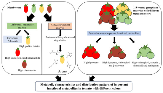 The framework of this research is illustrated in Figure 7. Metabolomic and quantitative analyses clarified the metabolic uniqueness of different colored tomatoes, with flavonoids and alkaloids as key differential metabolites and amino acid biosynthesis, degradation, and metabolism emerging as core enriched biological processes. Yellow tomatoes accumulated high levels of L-glutamine, L-lysine, L-isoleucine, and L-leucine, and tomatoes of different colors showed significant differences in the content of functional metabolites. Practically, these insights refine germplasm selection for breeders by pinpointing color-linked metabolic pathways and target metabolites for nutritional and quality trait improvement. For the food industry, they can guide the development of functional tomato products by leveraging color-specific metabolite advantages. Consumers gain a more precise basis for color-based selection, aligning dietary needs with specific functional components.