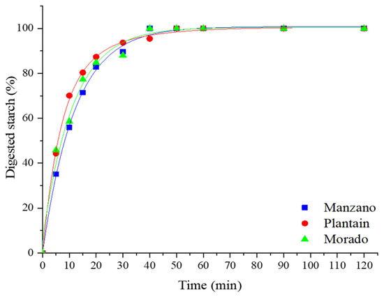 The starch hydrolysis curves of cooked banana flours are shown in Figure 1. Unripe banana flour is used as a raw material in bakery products such as cookies, breakfast cereals, and pasta, which are typically consumed after cooking. The hybrid cultivars (manzano and plantain), which are consumed as dessert and after cooking, respectively, presented a very close pattern, while the pure cultivar (morado) was hydrolyzed at a higher rate. The three types of unripe banana flours exhibited a rapid hydrolysis rate in the first 50 min of the test, after which no further changes in glucose release were observed. This pattern occurred because the samples were cooked before the analysis, and starch became available for hydrolysis by digestive enzymes. Figure 2 shows a log-of-slope (LOS) plot of the hydrolysis kinetics of the three banana cultivars. The fit of the linear regression (R2 value) for the two hybrid cultivars was high, with morado showing the lowest value. These R2 values are considered acceptable for modeling the experimental data. The starch hydrolysis constants (Table 3) indicate different hydrolysis rates among the three cultivars, which is important for determining the applications of unripe bananas. These results align with Englyst’s test results, where the three fractions are rapidly digestible starch (RDS), hydrolyzed within 20 min; slowly digestible starch (SDS), hydrolyzed between 20 and 120 min; and resistant starch (RS), the residual fraction after a 120 min hydrolysis time. Table 3 shows the starch hydrolysis kinetic constants for the first phase (60 min) of the test estimated from the LOS plot. The pure cultivar (morado) presented the highest constant value. A difference in this value was observed for the hybrid cultivars, influenced by the consumption characteristic (dessert and cooking) of these cultivars; plantain (cooking) presented a higher constant value (faster) than the manzano cultivar (dessert). The LOS plot shows that the kinetic was achieved in one phase, with a correlation coefficient (R2) > 0.9 for manzano and plantain, and an R2 < 0.9 for the Morado cultivar. The banana cultivar presenting highest constant value is more susceptible to hydrolysis.