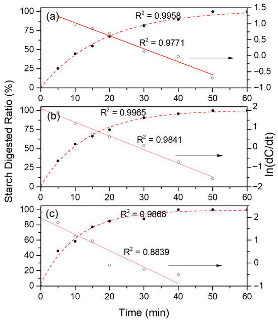 A graph of ln(dC/dt) vs. t was obtained, where the slope is the starch digestion constant (k, min−1).