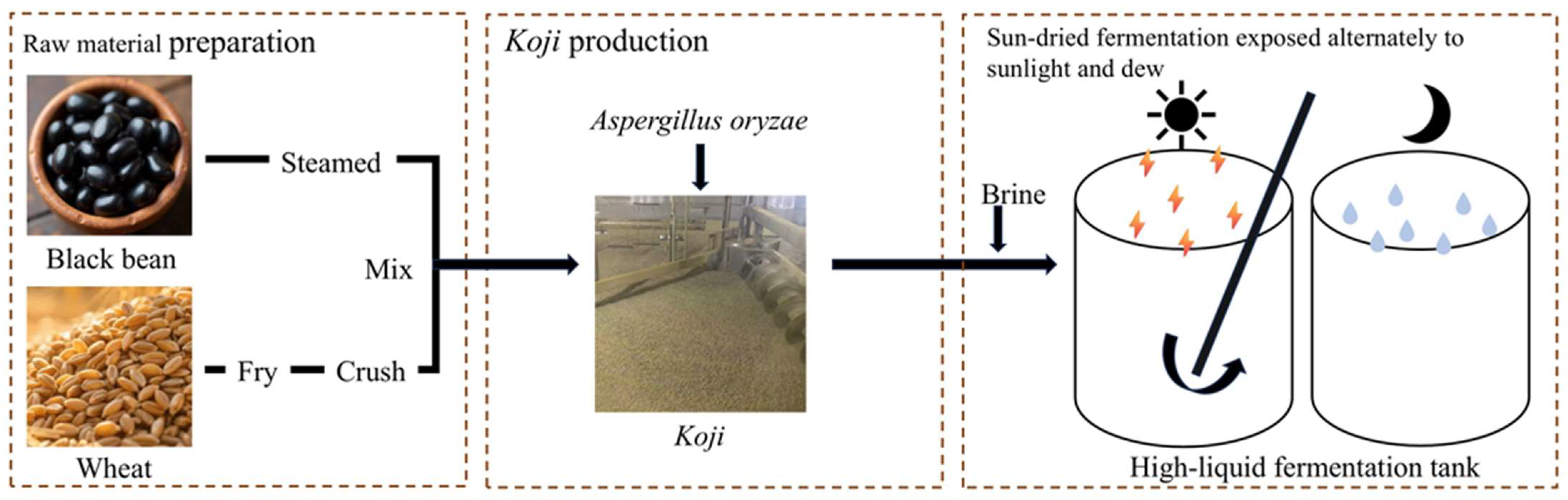- Luo, Y.; Meng, F.; Peng, Q.; Lin, Y.; Chen, S.; Li, Y. Elucidating metabolic and flavor evolution in traditional Chinese soy sauce during industrial-scale fermentation: A multi-omics approach. Food Chem. X 2025, 29, 102638. [Google Scholar] [CrossRef]