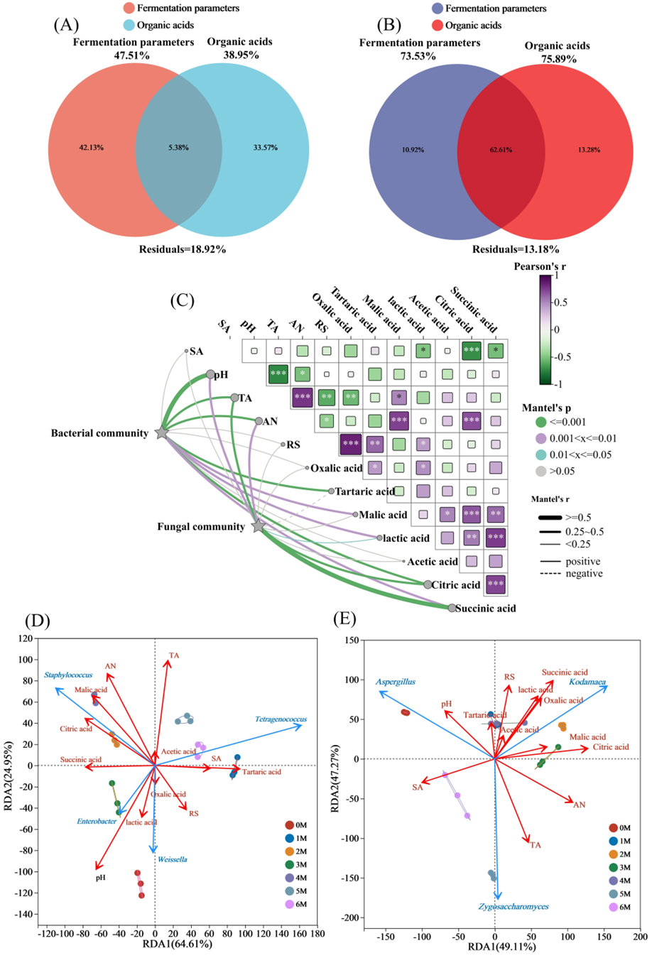 - Huang, T.; Lu, Z.; Peng, M.; Liu, Z.; Chai, L.; Zhang, X.; Shi, J.; Li, Q.; Xu, Z. Combined effects of fermentation starters and environmental factors on the microbial community assembly and flavor formation of Zhenjiang aromatic vinegar. Food Res. Int. 2022, 152, 110900. [Google Scholar] [CrossRef]