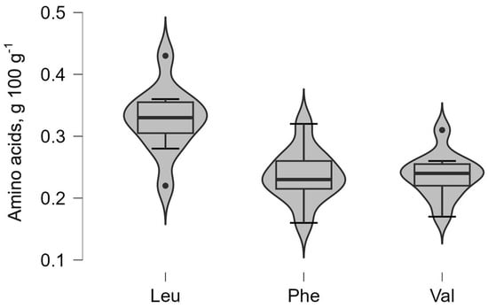 For the main amino acids, the violin plot shows the density of observations across the measurement range, where the width of the “violin” represents the relative frequency of values. The embedded boxplot indicates the median, first quartile (Q1), and third quartile (Q3) outliers which, when present, are displayed as individual points beyond the whiskers.