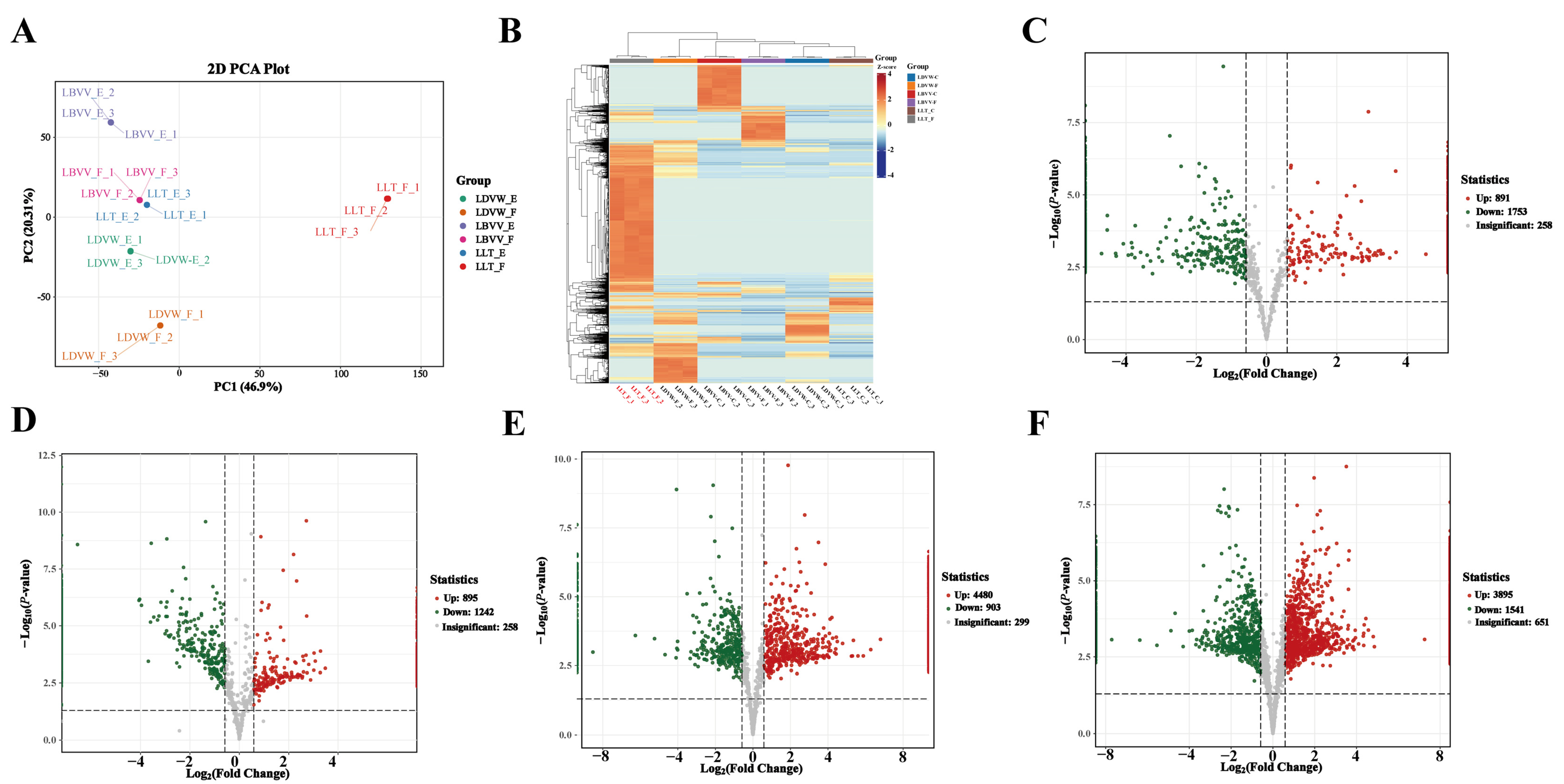 Figure 1. Peptidomics Analysis of Six Samples: PCA, Clustering, Differential Expression, and Functional Enrichment. (A). Principal component analysis of six sample groups (LLT_E, LBVV-E, LDVW-E, LLT_F, LBVV-F, LDVW-F). (B). Hierarchical clustering heatmap of peptidomic profiles. (CF). Volcano plots of differential peptide screening in four comparative groups, respectively, for LLT_E vs. LBVV-E, LLT_E vs. LDVW-E, LLT_F vs. LBVV-F, and LLT_F vs. LDVW-F.